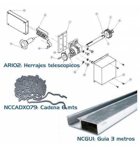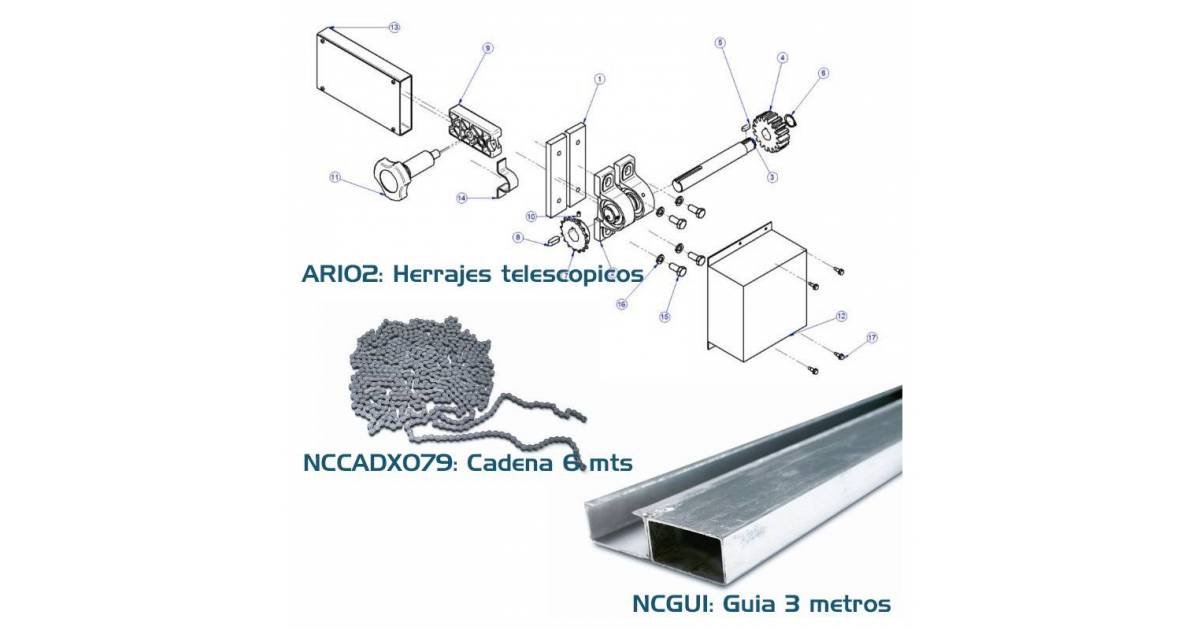 El kit ARI02 de Erreka son unos herrajes para motorizar puertas correderas que son telescópicas, además lo suministramos con una guía de 3 metros y el sistema de transmisión de cadena.