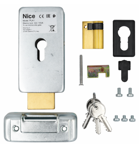 Electrocerradura vertical Nice PLA10 a 12V para puertas batientes.
