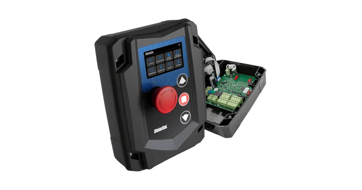 Central electrónica Motorline MC93-300 de control para portones seccionales, equipada con pantalla táctil interactiva para realizar configuraciones, diagnósticos y monitorizar el sistema.