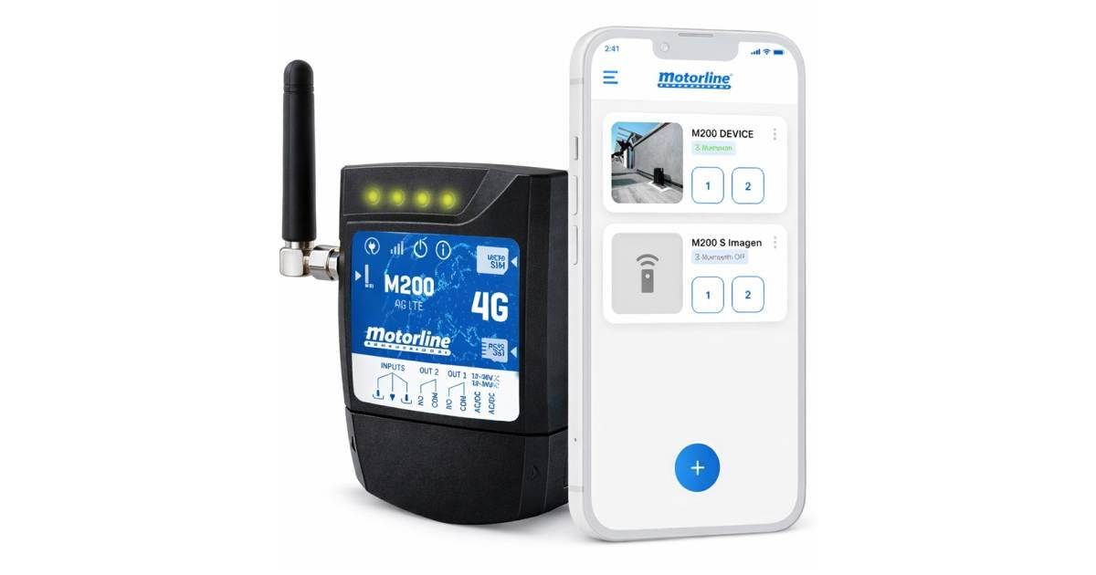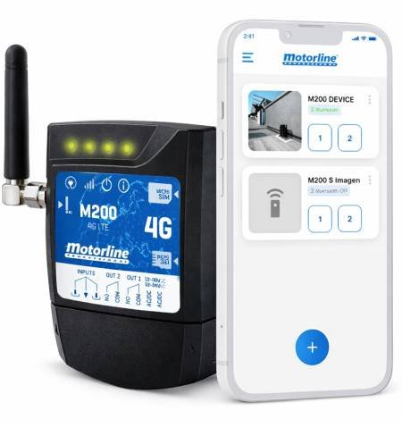 Receptor de última generación Motorline M200 (4G GSM/Bluetooth) con control de accesos, destinado para abrir puertas automáticas de garaje con nuestro teléfono móvil. La gestión del módulo se gestiona con la App gratuita de Motorline disponible para Android y iPhone. Novedad 2024: Ya es posible administrar M200 desde un Portal WEB.