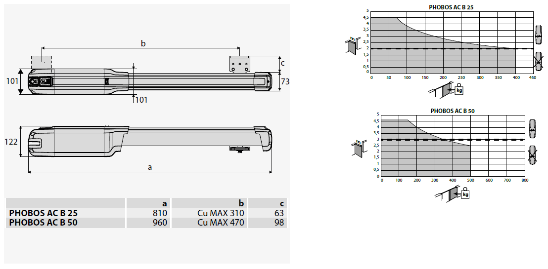 - PHOBOS AC B25 (P935132 00002): Operador 230V para cancelas batientes de hasta 400 kg de peso y 2.5 m de longitud. Interruptor de límite de tiempo de trabajo.