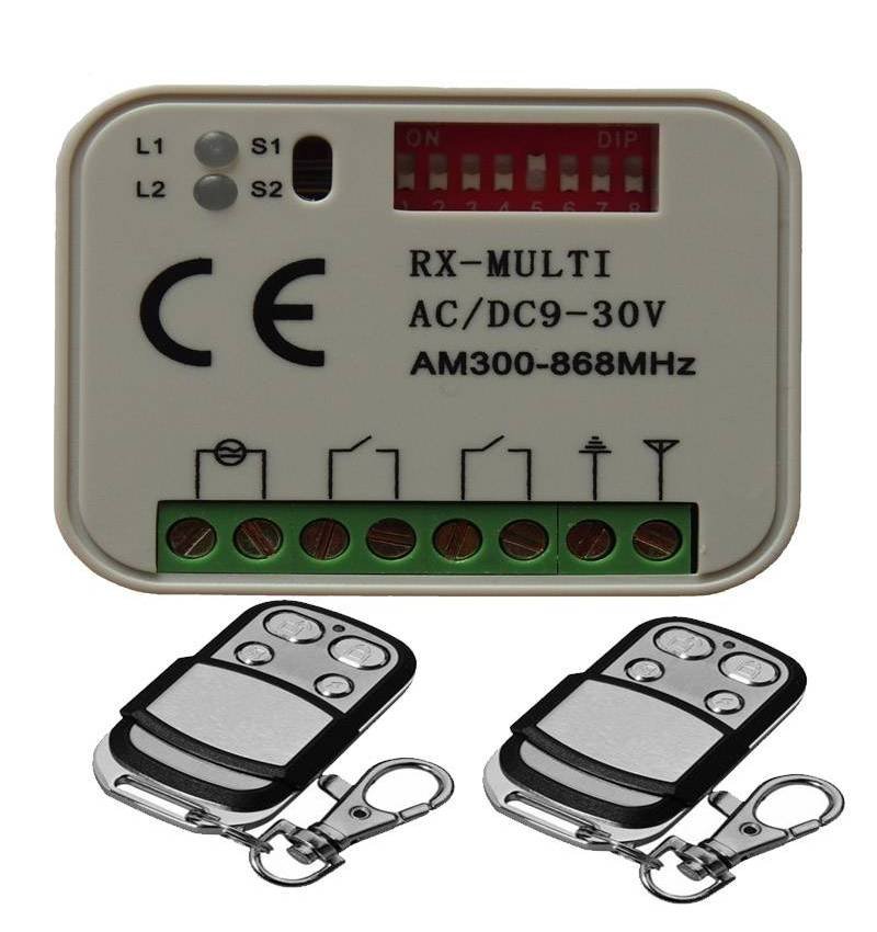 RX-MULTI es un receptor universal multifrecuencia que nos permite memorizar hasta 250 códigos ya sean mandos originales o compatibles, entre las frecuencias 300/433/868 MHz en formato AM/FM