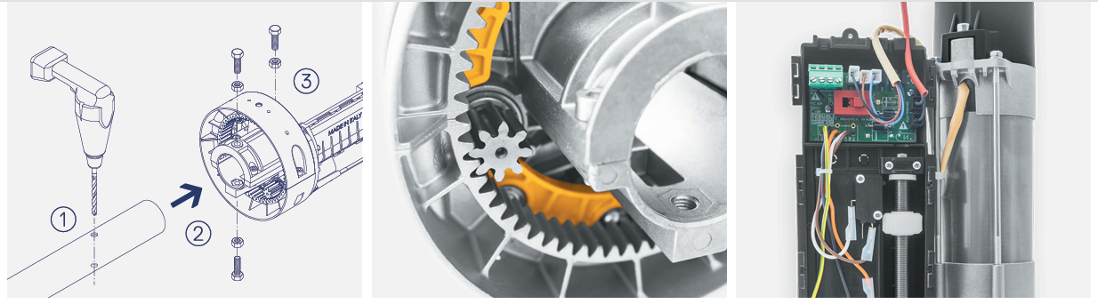 Conçu pour les fabricants de fermetures à rouleaux, il est installé très facilement en quelques étapes. Pour installer Superbe, il vous suffit d'effectuer un trou traversant dans un tube de fermeture à rouleaux, entrez le moteur dans le tube et, enfin, réparez-le.