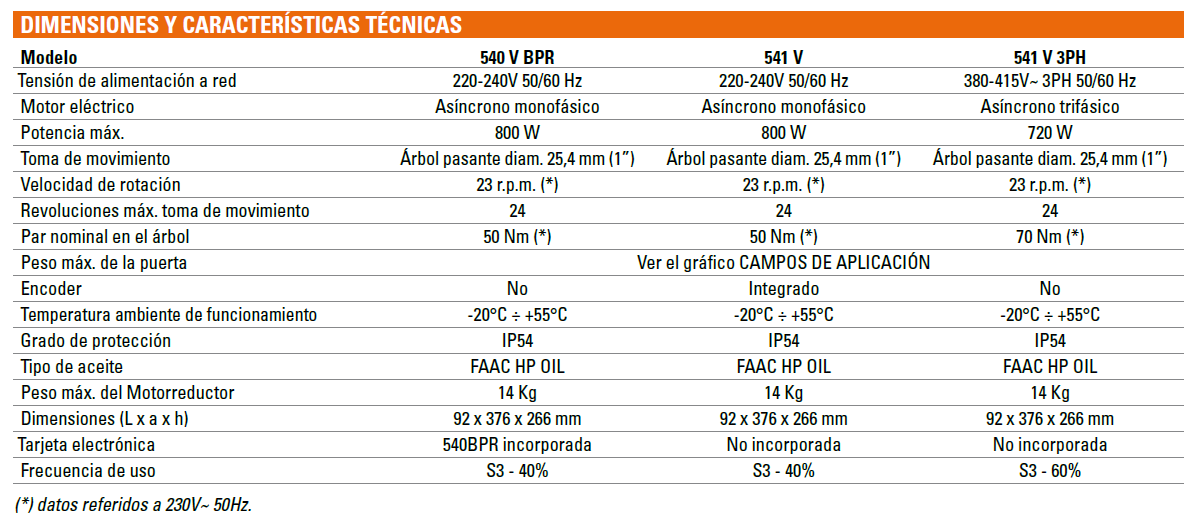 Caractéristiques techniques FAAC 540 V / 541 V / 541 V 3PH