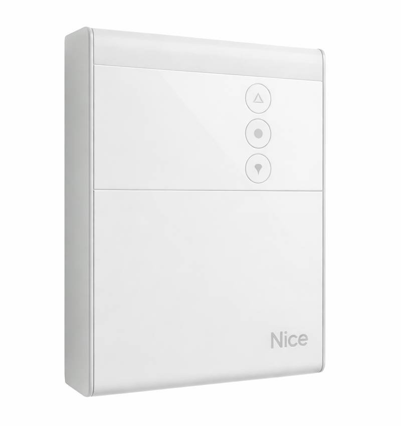 Centre de commandement Nice SPYBOXB indépendant pour contrôler le moteur sectionnel SPY, composé de lumière de courtoisie LED et trois pousseurs pour conduire l'automatisme de l'extérieur de la boîte. Récepteur intégré pour émetteurs Nice.