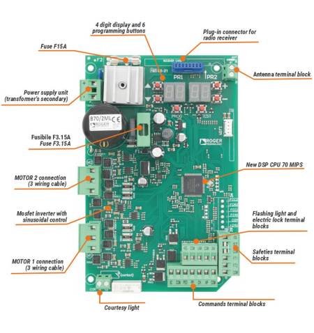 The central 24V B70 / 2ml For actuators of one or two engines Roger Brushless, intended for applications with Folding leaves for residential or community use. Has a Display of functions and keys for the programming and configuration of the parameters.