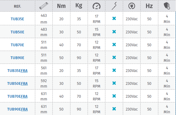 - Tub90 efra: 50nm mechanical motor (90kg) with built-in receiver