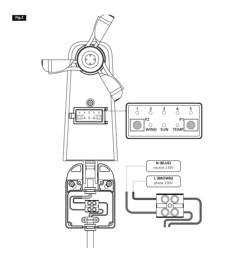 Anemometer with sun sensor and temperature V2 Typhoon Signal via radio and cell food Solare, for tubular blinds and awnings.