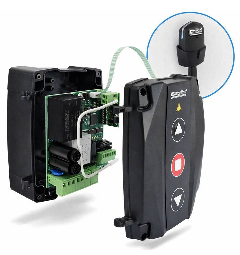 O kit incorpora 2 controles Motorline RollingCode de Falk 433,92 MHz, oferecendo segurança avançada por meio de código evolucionário e total compatibilidade com a planta.