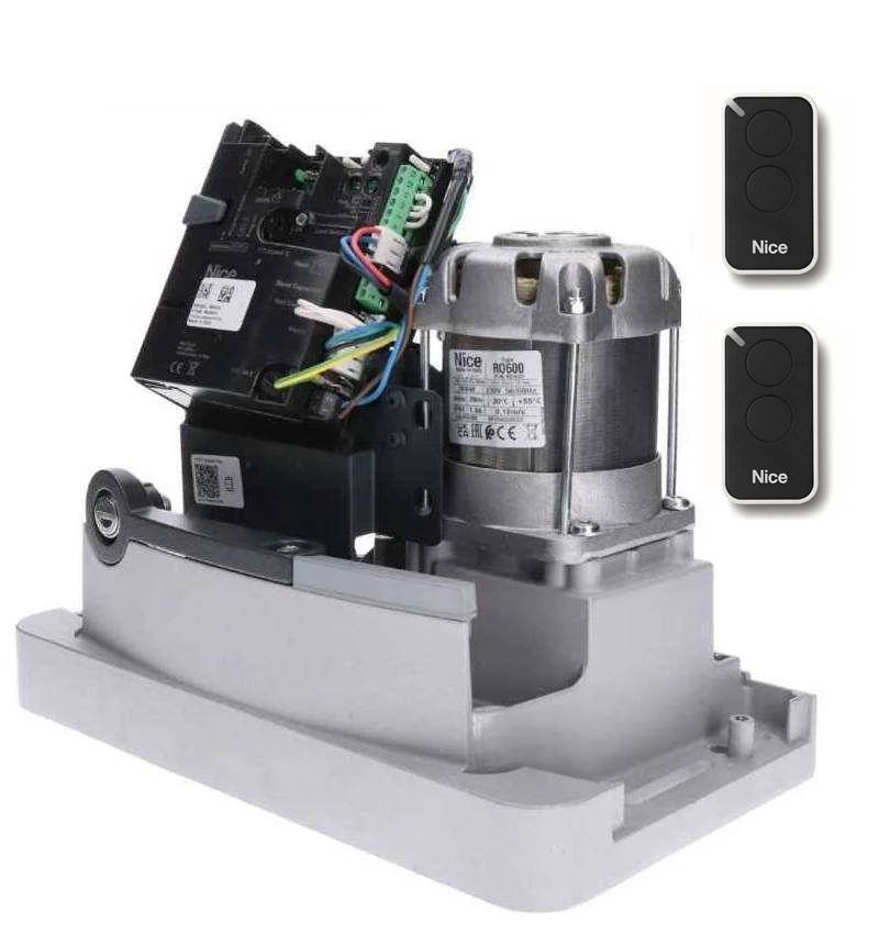 Motor deslizante Nice ROBO600 eletromecânica 230Vac para cancelamentos residenciais até 600KG. Incorporou um caixa de comando com agendamento automático e receptor 433 MHz compatível com emissoras Nice UM.