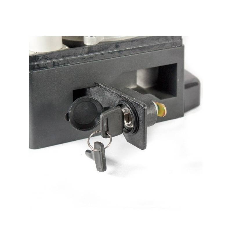 Ele tem um sistema de desbloqueio para abertura manual em caso de falha.
